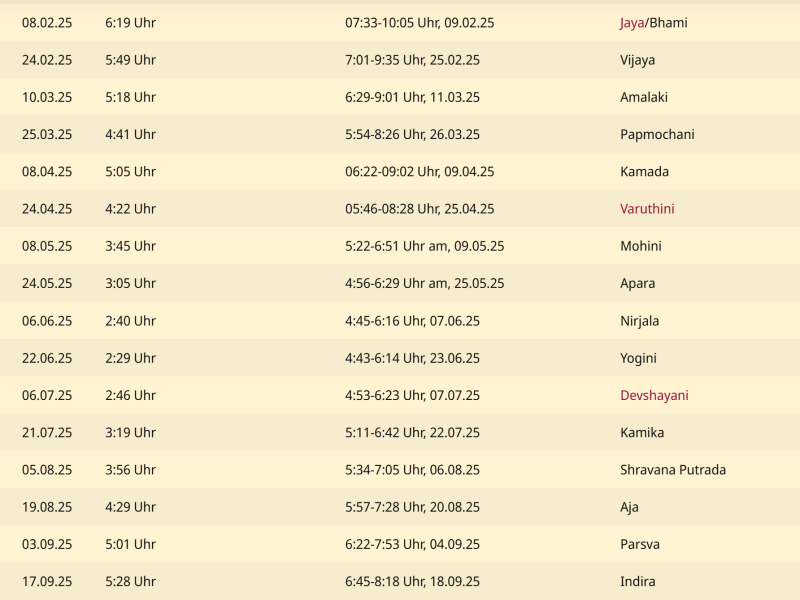 Ekadashi ist ein Zeitplan für Mondtage, die zum Fasten gedacht sind. Das Leben auf unserem Planeten hängt von der Bewegung des Mondes ab und diese Mondtage sind günstig für die Reinigung. Versuchen Sie, im Jahr 2025 nach dem Mondkalender zu fasten, und Sie werden merken, wie Kraft und Leichtigkeit in Ihrem Körper und Geist erscheinen. Speichern Sie sich einen Fastenkalender für 2025 und planen Sie, Fastentage einzuhalten. Gesundheit und Langlebigkeit liegen in Ihren Händen!